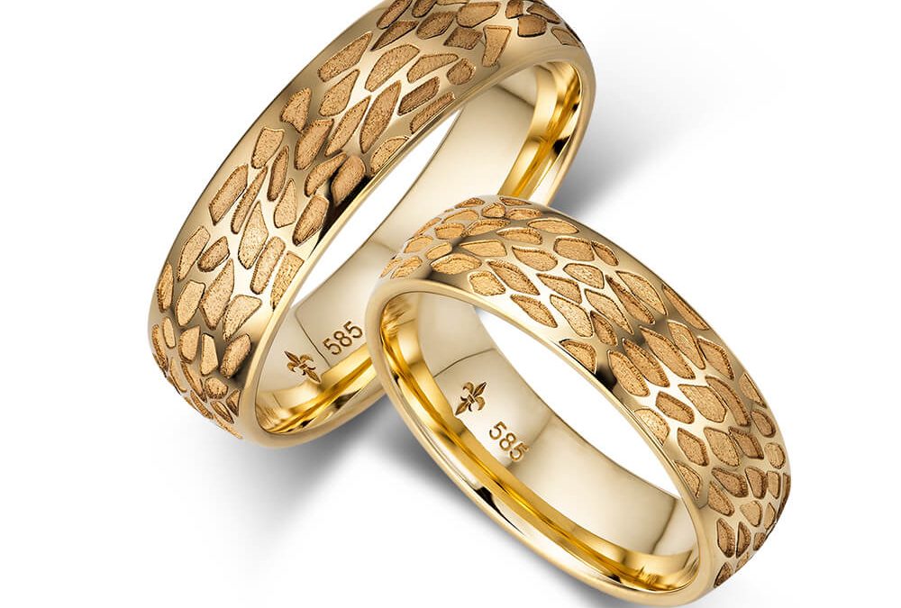Trauringe Gelbgold I-VT-3-22266 Außergewöhnliche 585er Gelbgoldringe mit mattierten Musterfugen in 6mm Breite. Extravagant und modisch zugleich, der Ring für Kenner.